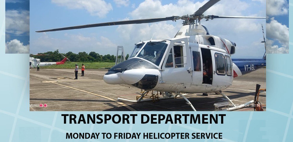 In view of the current road conditions between Dimapur and Kohima, the Transport Department, Government of Nagaland, has introduced a daily helicopter service (Monday to Friday) to connect the two locations until road conditions improve.